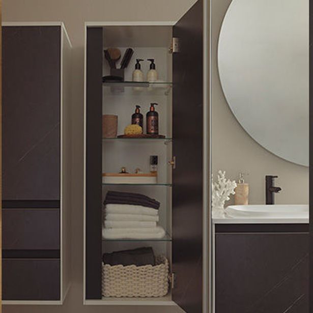 P1302 je visoka kopalniška omara, ki ima v notranjosti štiri steklene police, kar omogoča vrhunsko organizacijo kopalnice in s tem enostaven dostop do vaših kopalniških potrebščin. Vgradni aluminijasti ročaji in mehko zapiranje na dotik poudarjajo sodoben videz omare ter zagotavljajo eleganten in minimalističen dizajn.