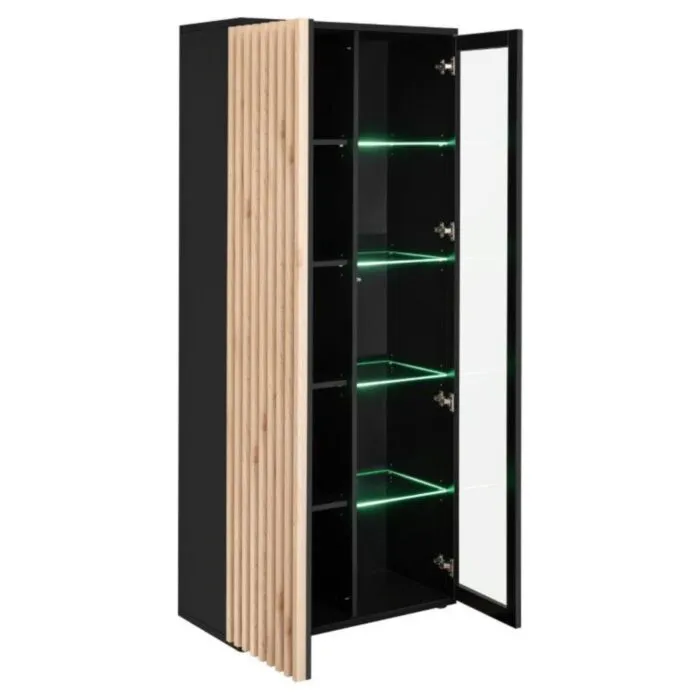 Visoka vitrina KAMERON je elegantna ter atraktivna. Moderen dizajn z dodatki, črnega stekla ter lamelami v svetlem hrastu, se bo podal v vsak prostor. Vitrina ima kombinacijo črnega stekla katera vsebuje steklene police. Katere imajo še dodatno led osvetlitev.