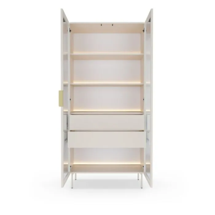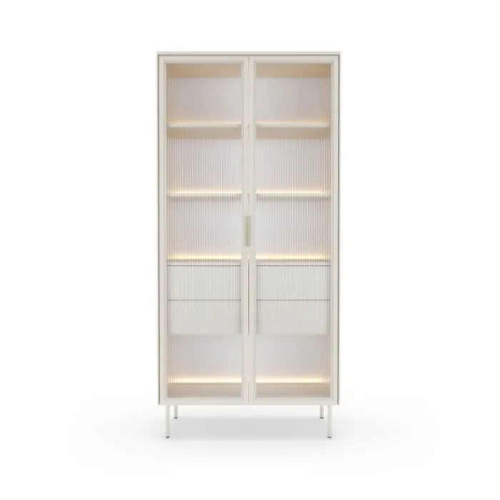Visoka vitrina LUMPI kašmir, ni le osupljiva temveč tudi praktična. Elegantna barva naredi kolekcijo brezčasno in elegantno. Steklo na frontah daje pohištvu presenetljiv in eleganten videz. Visoka vitrina je narejena iz kakovostnega kaljenega stekla in MDF-ja. Ima ABS robove, ki zagotavljajo večjo odpornost proti udarcem, vlagi in obrabi ter podaljšujejo njeno življenjsko dobo.