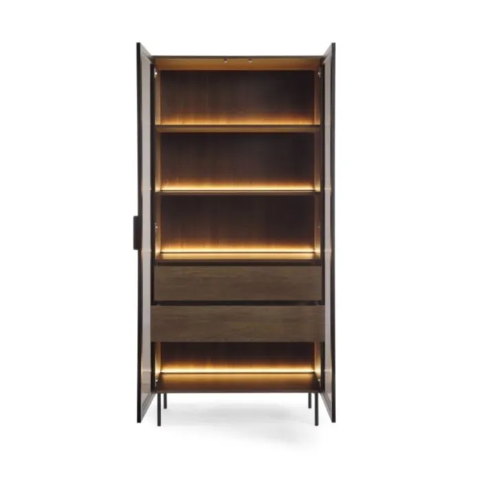 ABS robovi ne le ščitijo pred poškodbami, ampak poskrbijo tudi za lepši in elegantnejši videz pohištva. Ima kovinske noge črni barvi. Kovinske noge zagotavljajo dodatno stabilnost. Vitrina ima tudi led osvetlitev, pripomore njeni funkcionalnosti in eleganci. Ima dva prostorna predala v notranjosti, katera se odpirata na sistem “PUSH TO OPEN“.