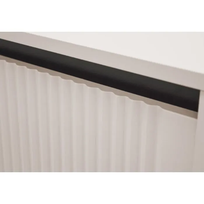 Robovi so obdelani z ABS materialom, kar povečuje odpornost na obrabo in podaljšuje življenjsko dobo pohištva. Fronte so iz MDF plošč debeline 16 mm in prav tako v bež barvi, kar dodaja eleganco in sodoben pridih. Vitrina se ponaša z elegantnimi nogicami v črni metal barvi, katerih višina znaša 15 cm.