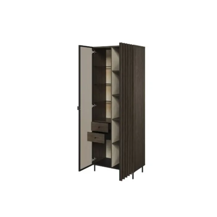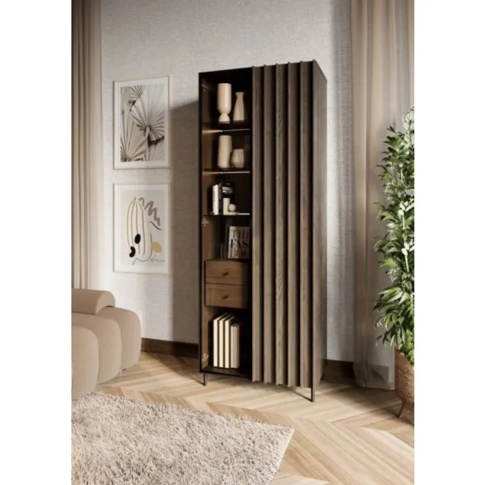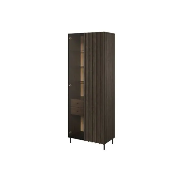 Vitrina HORIZON je večnamenski kos pohištva, ki ne omogoča le shranjevanja in razstavljanja različnih predmetov, temveč služi tudi kot dekorativni kos pohištva. Zahvaljujoč steklenim vratom in policam vam omogoča razstavljanje vaših najljubših stvari. Ima črne kovinske noge za dodatno stabilnost in eleganco. Ima 10 polic in 2 predala. Izdelana je iz laminirane plošče debeline 166 mm in 22 mm.