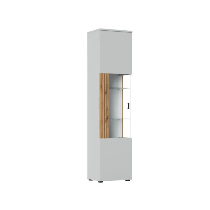 Elegantna vitrina VIVIJA v hrastovi in sivi barvi prinaša brezčasno eleganco v vsak prostor. Izdelana je iz visokokakovostne iverne plošče debeline 16-22 mm in MDF-ja, zaščitena z ABS robovi, ki zagotavljajo dolgotrajno vzdržljivost in odpornost za vsakodnevno uporabo.