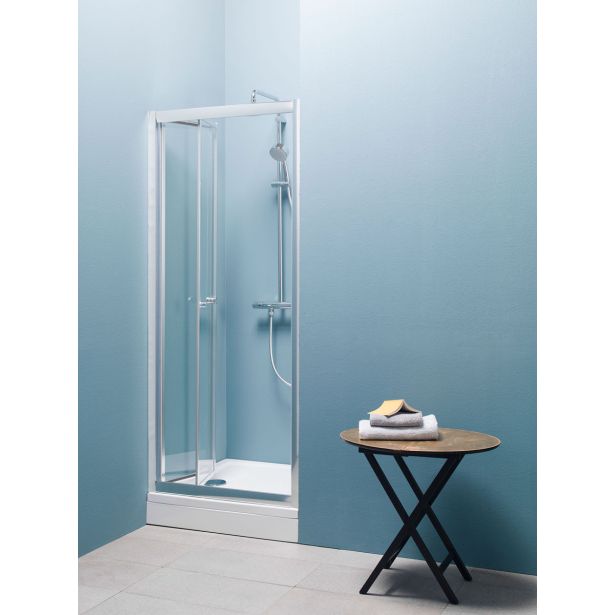 Samostojna zložljiva tuš vrata. Na voljo s kaljenim prozornim steklom debeline 4 mm in Silver profili. Vhodna odprtina 57 cm. Kotna postavitev.