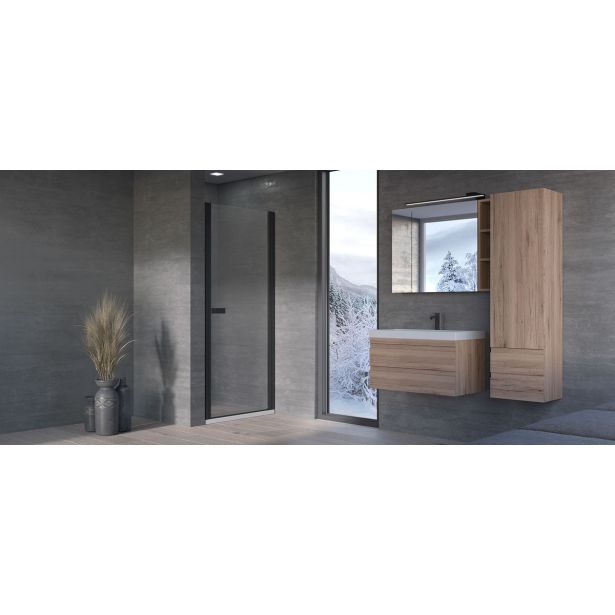 Samostojna tuš vrata Andromeda z enostranskim odpiranjem odlikujejo velike steklene površine, enostavno čiščenje, Clean coat premaz, minimalen ročaj, dvižni obračalni profil in velika vhodna odprtina 67 cm. Črni profili, kaljeno prozorno steklo debeline 6 mm, nišna postavitev.
