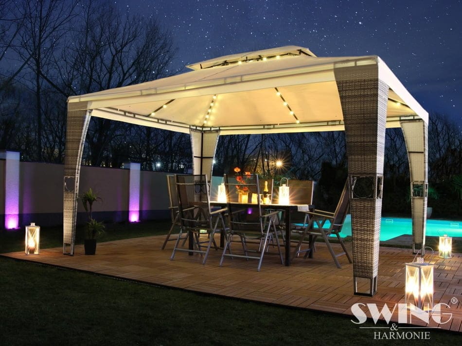 Ob nepozabnih večernih zabavah na vrtu pod vrtnim paviljonom je zelo pomembna tudi osvetlitev. Pri osvetlitvi zunanjih površin pazimo na svetlobno onesnaževanje in namesto svetil, ki svetijo v nebo raje izberimo takšne, ki so usmerjene v tla ali pa kakšen dekorativni element. Zunanja svetila lahko na primer prav lepo osvetljujejo grm, Vrtni paviljon ali fasado, hkrati pa ne bodejo v oči. Zelo priljubljene so trajnostno naravnane naravne svetilke, ki se polnijo s pomočjo sončnih celic ter jih lahko umestimo tudi na lokacije, kjer ni dostopa do elektrike. Pri vrtnem paviljonu Minzo, Royal in Lavo k paketu dodamo še led svetilke. Zelo modne so tudi svetlobne verige manjših žarnic starinskega izgleda, ki jih lahko razobesimo po vrtnih paviljonih, pergolah, drevesih ali ograjah.