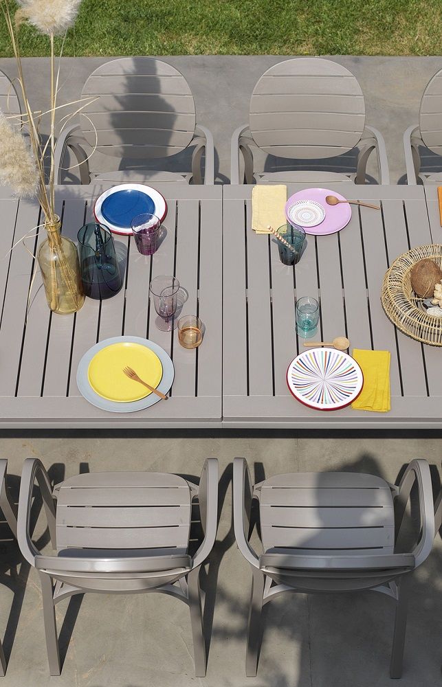 Obogatite vašo teraso z vrtno garnituro Alloro, priznanega proizvajalca vrtnega pohištva NARDI. Garnitura je sestavljena iz raztegljive vrtne mize Alloro in osmih stolov Palma z nasloni za roke. Barvna kombinacija bele in svetlo rjave barve se bo vklopila v vsako okolje. Miza je izdelana iz visokokakovostnih materialov, ki so odporni na vremenske vplive. Okvir in noge mize so izdelane iz prevlečenega aluminija, vrhnja plošča pa iz vzdržljivega DurelTop materiala odpornega na UV žarke. Stoli so v celoti narejeni iz enakomerno barvanega polipropilena. Prijetni so na otip in imajo mat videz. Smolo iz katere so narejeni, je možno po končani uporabi reciklirati.