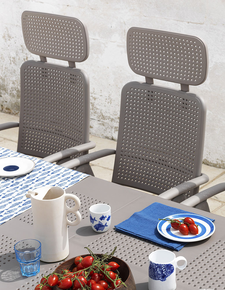 Raztegljiva vrtna miza LIBECCIO vrhunskega proizvajalca NARDI. Njen dizajn spominja na tradicionalno železno pohištvo. Mizna plošča je okrašena z vzorcem majhnih cvetov, ki se ponavljajo na celotni površini. Okrogle noge, ki so po višini tudi nastavljive, so na površino pritrjene s preprostim vijačnim sistemom. Odlična je za vsak prostor na odprtem, kjer si želite skupnih trenutkov z družino in prijatelji. Na sredini mize je priročna okrogla odprtina skozi katero lahko umestite senčnik. Polypropylen fiberglass: lahek, dolgotrajen, nestrupen in antistatičen material, odporen na zunanje vremenske vplive. Material je obdelan z anti-UV sredstvi in je enakomerno obarvan z netoksičnimi pigmenti. Vrtni počivalniki DARSENA so zložljivi izdelani iz enakomerno obarvanega polipropilena, kateremu so dodani UV dodatni, ta boljšo UV odpornost. Površina stola je matirana in je prijetna na otip. Noge stola so opremljene s proti drsnimi čepi. Njegov visok hrbtni naslon lahko prilagodimo v štiri položaje