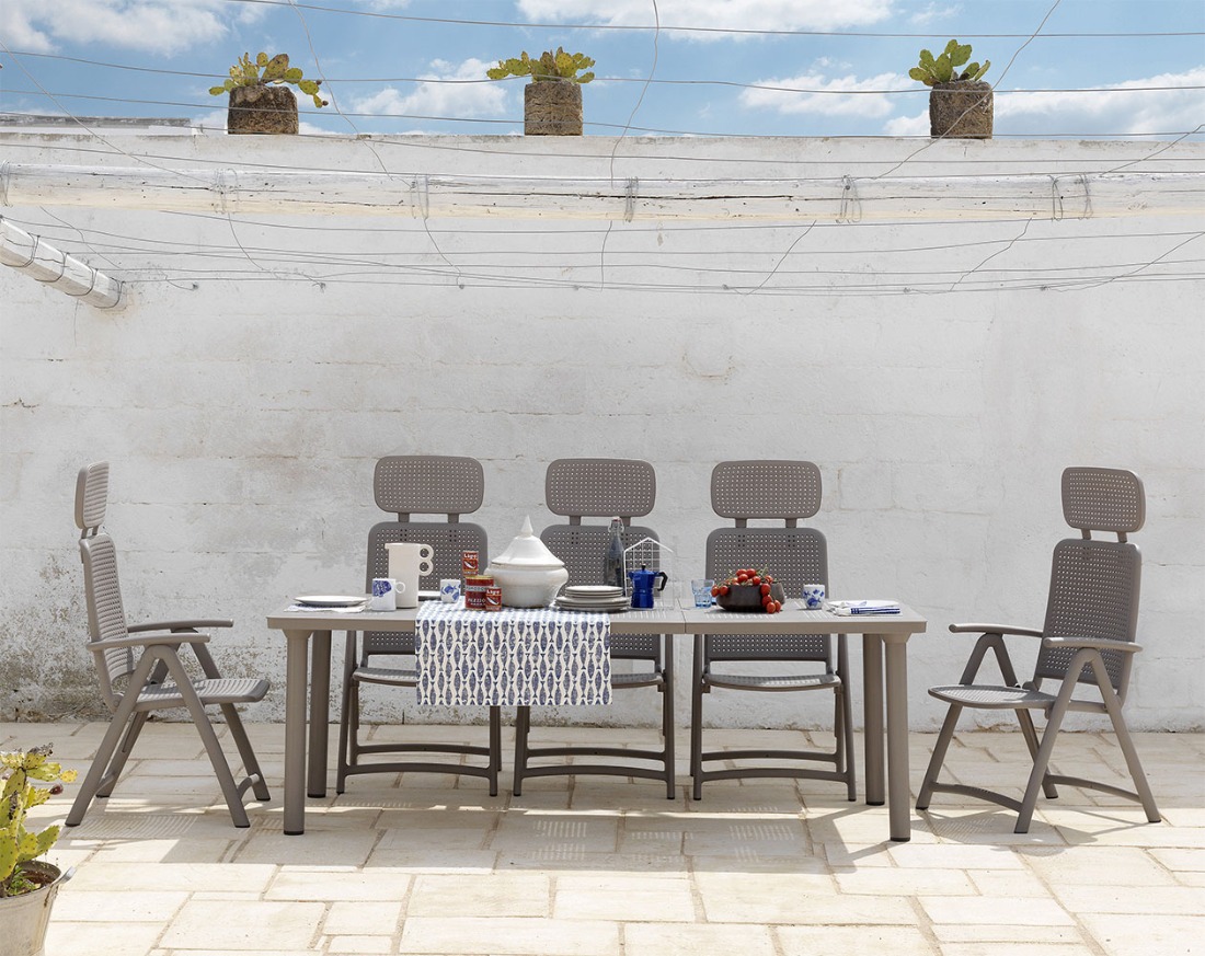 Moderna raztegljiva vrtna garnitura proizvajalca NARDI. Garnituro sestavlja raztegljiva vrtna miza LIBECCIO 160 ter 6 počivalnikov DARSENA oboje v tortora barvi.