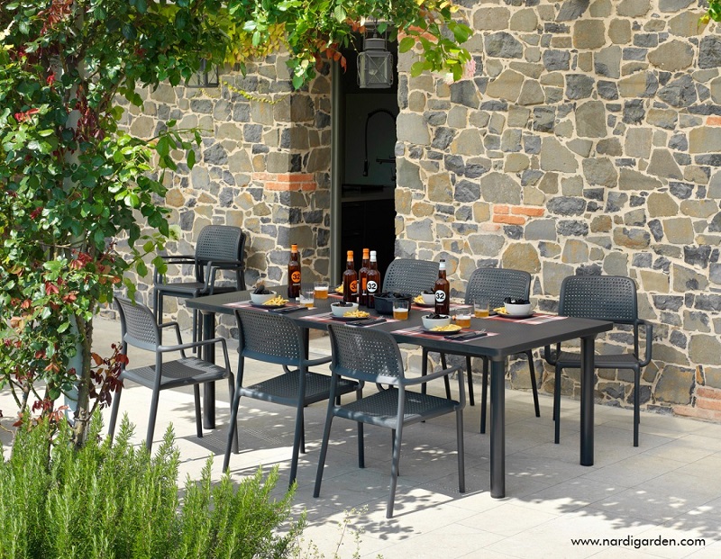 Moderna raztegljiva vrtna garnitura proizvajalca NARDI. Garnituro sestavlja raztegljiva vrtna miza LIBECCIO 160 ter 8X Vrtni stol BORA na voljo v tortora (rjava) ali antracit (črni) barvi.