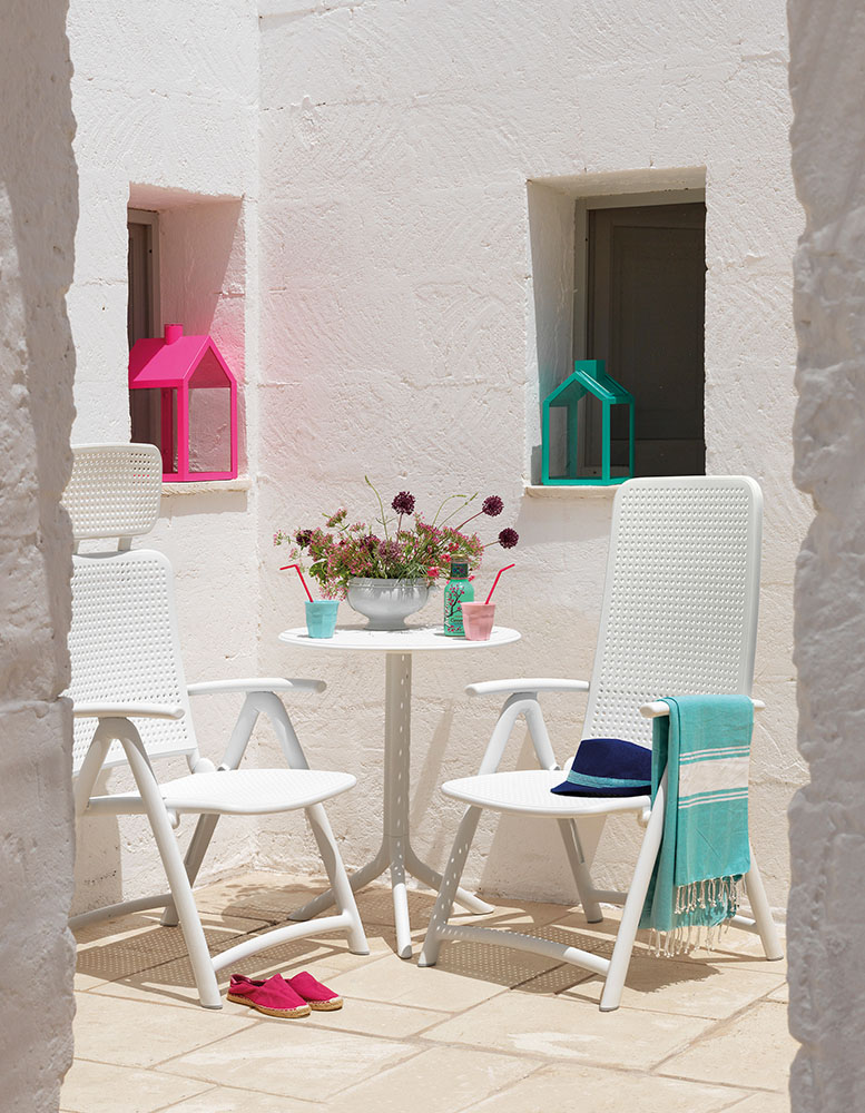 Vrtna miza Spritz v beli barvi, lahko enostavno sestavimo in razstavimo. K mizi je priložen komplet za namestitev na dve višini. Mizica Spritz je izdelana iz smole iz steklenih vlaken z dodatkom UV zaščite. Spritz je z okroglo ploščo in trinožnim dnom. Površina je mat in prijetna na dotik. Primerna za zunanjo uporabo, a popolna tudi za notranjo. Vse dobre funkcionalnosti združuje miza Spritz vrhunskega italijanskega proizvajalca vrtnega pohištva NARDI. Vrtni počivalniki DARSENA so zložljivi izdelani iz enakomerno obarvanega polipropilena, kateremu so dodani UV dodatni, ta boljšo UV odpornost. Površina stola je matirana in je prijetna na otip. Noge stola so opremljene s proti drsnimi čepi. Njegov visok hrbtni naslon lahko prilagodimo v štiri položaje