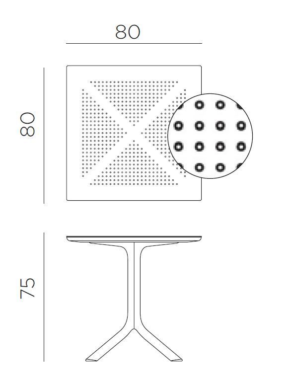 Posebej zasnovana kvadratna vrtna miza CLIP 80 priznanega italijanskega proizvajalca NARDI. Namenjena je predvsem za uporabo v majhnih prostorih; terasah stanovanj, restavracij, barov. Vrtno mizo lahko uporabite v zunanjih in notranjih prostorih. Zaradi svoje barve se bo lepo vključila v moderen ambient. Miza Clip 80 ima štirikrako osrednjo podporno nogo in mizno ploščo DurelTop iz polipropilena ojačanega s steklenimi vlakni. Ploščo krasi perforiran vzorec z okroglimi luknjicami. Površina je na otip prijetna z mat videzom. Miza je moderne antracit barve. Po končani uporabi je izdelek mogoče reciklirati.