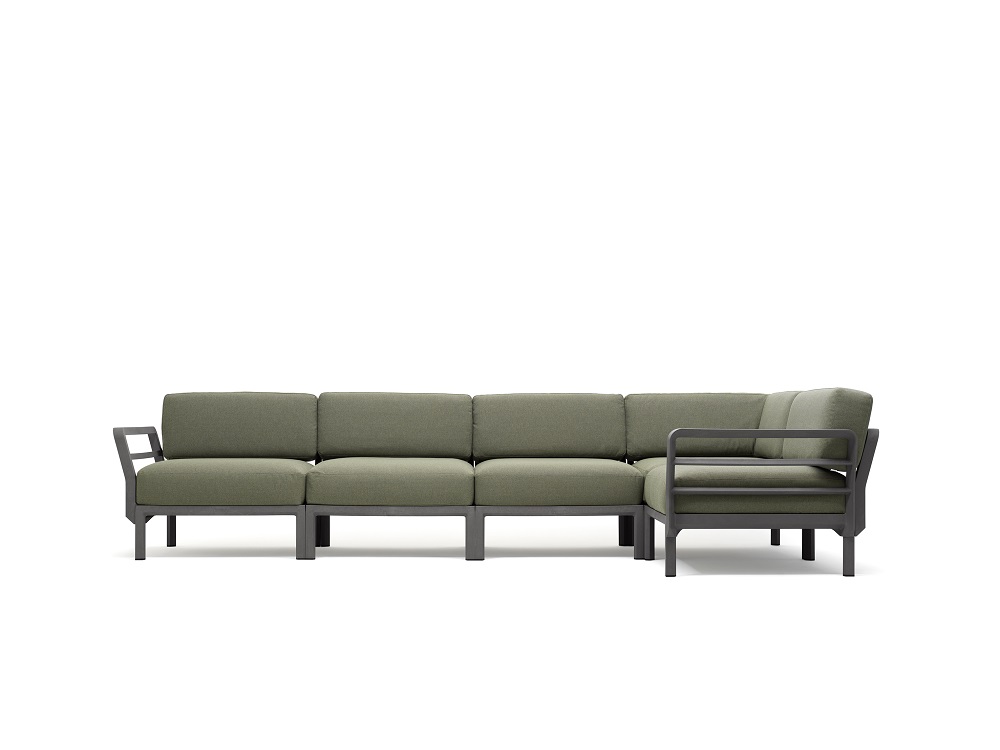 Vrtna sedežna garnitura Maximo 5, s strukturo regenerirane smole z visoko vsebnostjo recikliranih materialov. Okvir elementa je v barvi Basalto, blazine po izbiri. Garnituro lahko kupite posamično ali jo kombinirate z ostalimi elementi iz serije Maximo. Modularni sistem oblazinjenih sedežev omogoča lastno konfiguracijo, tako da lahko elemente Maximo po želji kombinirate. Okvir vrtnega pohištva Maximo je izdelan iz enakomerno obarvanega regeneriranega polipropilena iz steklenih vlaken z dodatki za UV obstojnost. Naslonjala za hrbet in roke je mogoče pritrditi na vse strani sedeža s sistemom zaklepanja brez uporabe vijakov. Izbirate lahko med štirimi barvami blazin katere so odstranljive in se odpirajo z zadrgo.