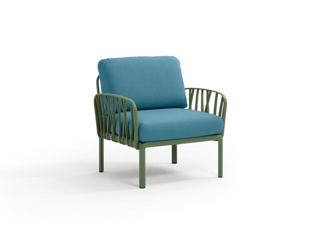 Fotelj Komodo v Agave zeleni barvi priznanega italijanskega proizvajalca vrtnega pohištva NARDI. Sproščujoč počivalnik z naslonjali za roke in blazinami. Naročite ga lahko ločeno ali konfigurirano kot sestavni element večjih garnitur. Fotelj je italijanske izdelave izdelan iz enakomerno obarvane polipropilenske smole, kateri so dodani UV dodatki. Material je izredno odporen na vremenske vplive, se ne razbarva in ne razpoka. Fotelju so dodane kvalitetne blazine, kraljevske debeline. Blazina za naslon je 18cm, blazina za sedišče je 22cm. Fotelj lahko uporabljate samostojno ali kot dodatek k vrtni garnituri KOMODO 5. Možna je kombinacija različnih elementov iz serije KOMODO, tako da si lahko ustvarite poljubno sedežno garnituro. Originalni modularni sistem zunanjih sedežev Komodo je prejel tudi nagrado Good Design Award 2019, eno najpomembnejših mednarodnih nagrad za kakovost in inovativnost v oblikovanju, ki jo je ustanovil Chicago Athenaeum.