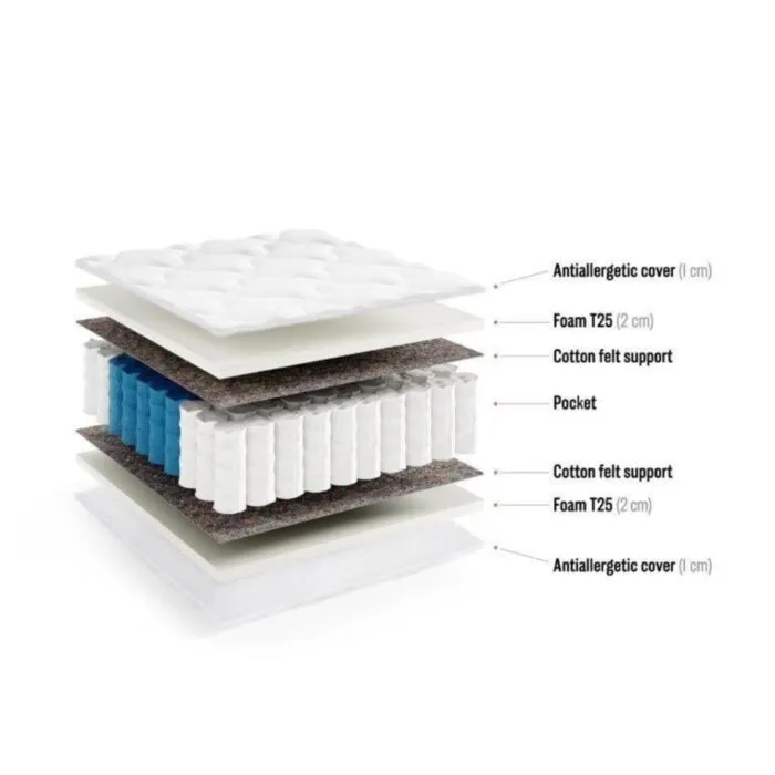 Vzmetnica BALA je dvostranska vzmetnica izdelana iz žepkastih vzmeti, na eni strani obložena s kokosovo ploščo debeline 1 cm, na drugi strani pa s poliuretansko peno debeline 2 cm. Ima 7 con trdote. Dvostransko srednje trdo ležišče pena kokos z dvema trdotama: trdo in srednje trdo.