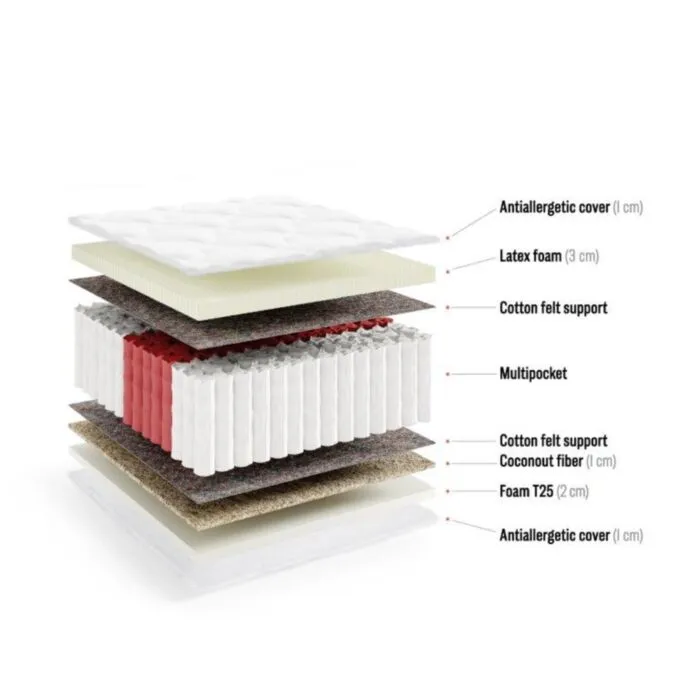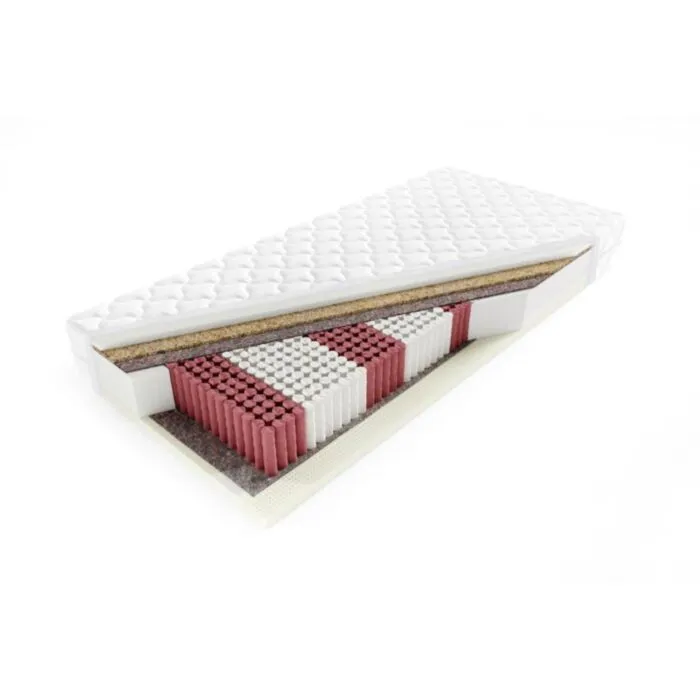 Vzmetnica RELAX je dvostransko ležišče iz pene. Izdelana je iz žepkastih vzmeti Multipocket – 7 trdotnih območij, obloženih z 1 cm debelo kokosovo ploščo na eni strani in 2 cm debelo peno na drugi strani. Ima pralno prevleko.