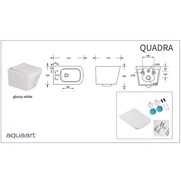 WC ŠKOLJKA, VISEČA FEROTEHNA QUADRA BREZ ROBA Z WC DESKO