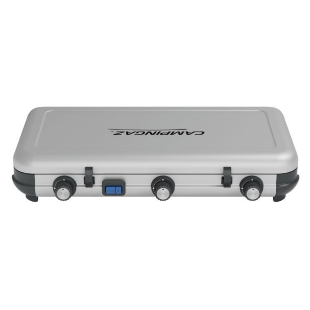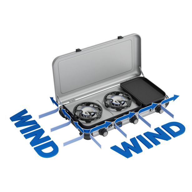 Ta štedilnik z dvojnim gorilnikom in dodatno rešetko ponuja več možnosti kuhanja, zaradi česar je idealen za družinska kampiranja in daljša bivanja. Širši od standardnega štedilnika, a še vedno izjemno prenosljiv, ima ta štedilnik dva 1800 W gorilnika in dodatni 900 W cevni gorilnik, ki greje ločeno rešetko. Gorilniki so zaščiteni s tehnologijo FLAMEGUARD, ki zagotavlja boljše delovanje gorilnika in manjšo porabo plina tudi pri močnejšem vetru. Nosilci za posodo sprejmejo dve veliki posodi, lahka rešetka iz tlačno litega aluminija pa ima PTFE premaz proti prijemanju za najboljše rezultate kuhanja. Vse podstavke za posodo in rešetko je mogoče odstraniti za enostavno čiščenje in postaviti v pomivalni stroj. Dvojni piezo vžig zagotavlja varno in takojšnjo osvetlitev brez potrebe po vžigalicah, medtem ko tanek dizajn z jeklenim pokrovom olajša prenašanje in zagotavlja prihranek prostora pri pakiranju vašega avtomobila ali avtodoma.