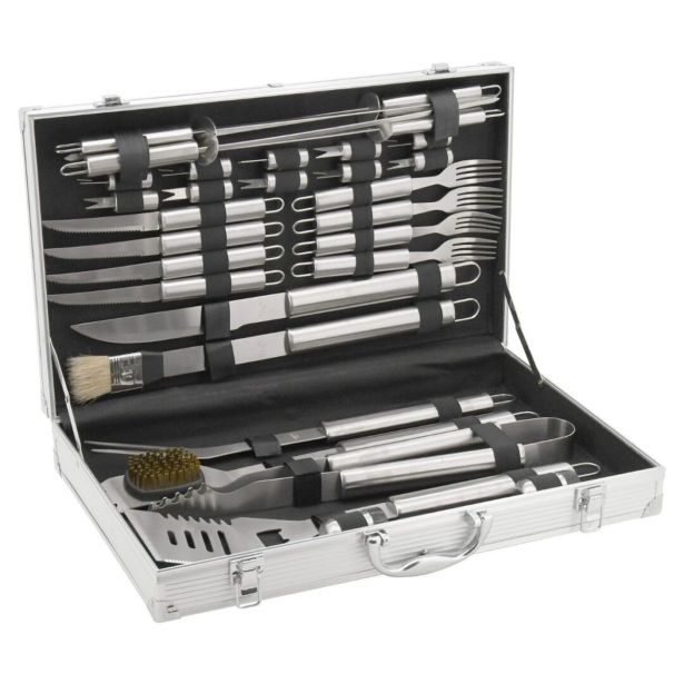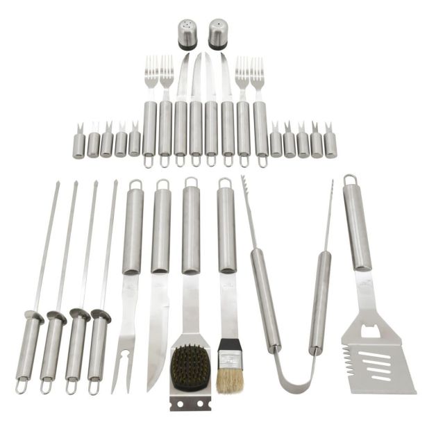Ta pribor za žar v setu vsebuje prav vse pripomočke, ki jih potrebujete za pripravo različnih okusnih jedi ali pri njihovi postrežbi. Prav vsi pripomočki so narejeni iz visokokakovostnega nerjavečega jekla.