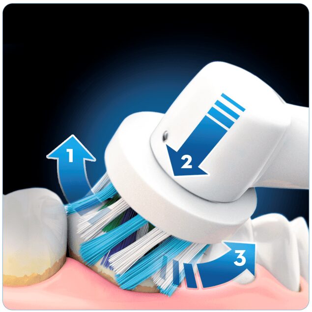 - Trojno delovanje glave ščetke z oscilacijami, rotacijami in pulzacijami razbije in odstrani do 100 % več zobnih oblog kot navadna ročna zobna ščetka.