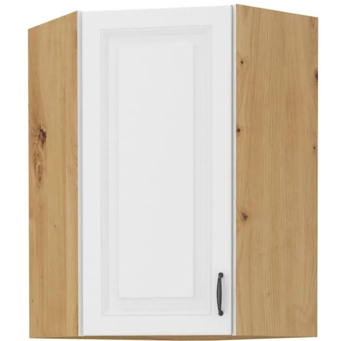 Zgornja kotna omara STIL 60 x 60G 2 je sestavljena iz fronte iz MDF plošče, debeline 16 mm, robovi so iz ABS 1 mm, ročaj pa je iz plastike v črni barvi. Korpus je narejen iz laminirane plošče, debeline 16 mm, robovi so iz melamina. Kuhinjski element je na voljo v barvi hrasta z belo mat barvo in ima mehko zapiranje.