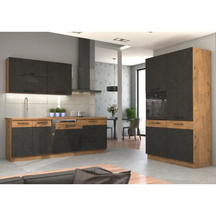 Zgornja omara PARIZ 50G dvižna je sestavljena iz fronte iz MDF plošče, debeline 16 mm, robovi so iz ABS 1 mm, ročaj je iz plastike v sivi barvi, debeline 19,2 mm. Korpus je narejen iz laminirane plošče, debeline 16 mm, robovi so iz melamina. Kuhinjski element je na voljo v barvi hrasta z matero in ima mehko zapiranje.