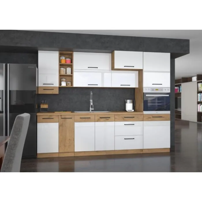 Zgornja omara PARIZ GLOS 60G 3 dvižna je sestavljena iz fronte iz laminirane plošče, debeline 16 mm, robovi so iz ABS 1 mm, ročaji so iz plastike. Korpus je iz laminirane plošče in ima melaminske obrobe. Kuhinjski element je na voljo v barvi belega visokega sijaja s hrastom in ima mehko zapiranje.