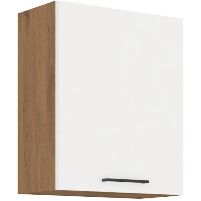Zgornja omara PARIZ GLOS 60G je sestavljena iz fronte iz laminirane plošče, debeline 16 mm, robovi so iz ABS 1 mm, ročaji so iz plastike. Korpus je iz laminirane plošče in ima melaminske obrobe. Kuhinjski element je na voljo v barvi belega visokega sijaja s hrastom in ima mehko zapiranje.