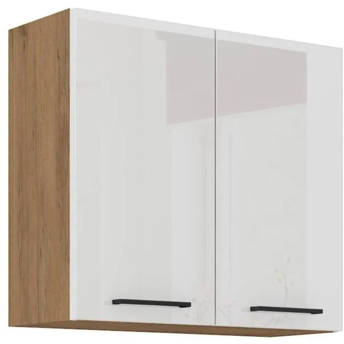 Zgornja omara PARIZ GLOS 80G je sestavljena iz fronte iz laminirane plošče, debeline 16 mm, robovi so iz ABS 1 mm, ročaji so iz plastike. Korpus je iz laminirane plošče in ima melaminske obrobe. Kuhinjski element je na voljo v barvi belega visokega sijaja s hrastom in ima mehko zapiranje.
