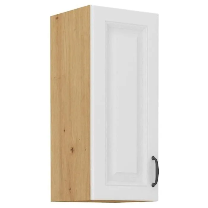 Zgornja omara STIL 30G ima fronto iz MDF plošče, debeline 16 mm, robovi so iz ABS 1 mm, ročaj pa je iz kovine v črni barvi. Korpus je narejen iz laminirane plošče, debeline 16 mm, robovi so iz melamina. Kuhinjski element je na voljo v barvi hrasta z belo mat barvo in ima mehko zapiranje.