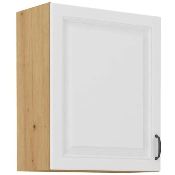Zgornja omara STIL 60G je sestavljena iz fronte iz MDF plošče, debeline 16 mm, robovi so iz ABS 1 mm, ročaj pa je iz kovine v črni barvi. Korpus je narejen iz laminirane plošče, debeline 16 mm, robovi so iz melamina. Kuhinjski element je na voljo v barvi hrasta z belo mat barvo in ima mehko zapiranje.