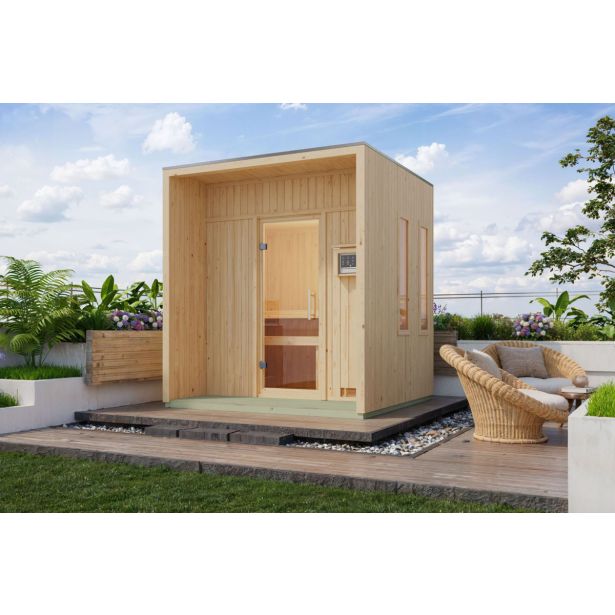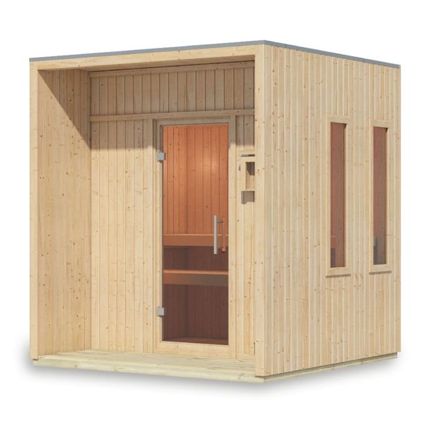 V notranjosti vas dve udobni klopi za savno vabita k sprostitvi in posedanju ali ležanju. Prozorna steklena vrata iz varnostnega stekla in dve stranski okni dajejo prostoru svetlo, prijazno vzdušje in ponujajo pomirjujoč pogled na zelenje – kot nalašč za pomirjujočo savna izkušnjo. Po potenju preprosto stopite na teraso z lesenimi tlemi in uživajte v trenutku pod odprtim nebom.