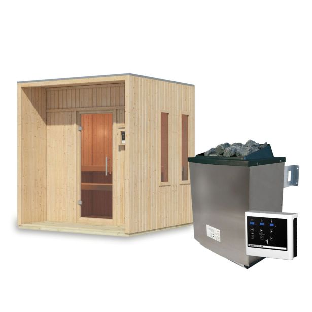 Z vključenim 9 kW grelnikom za savno, vključno z zunanjim upravljanjem, lahko uživate v pristni finski savni na svojem vrtu.