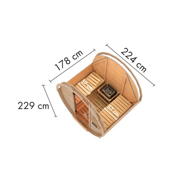 S svojo posebno okroglo obliko bo savna Karibu sod prava pika na i na vašem vrtu . Po napornem dnevu se sprostite v prijetni vrtni savni. Prostorski čudež ponuja dovolj prostora za sprostitev in počitek zahvaljujoč dvema integriranima klopema iz lesa trepetlike brez grč . Zahvaljujoč okrogli obliki doživite edinstveno kroženje zraka in toplote , kar omogoča še boljši razvoj učinka savne.