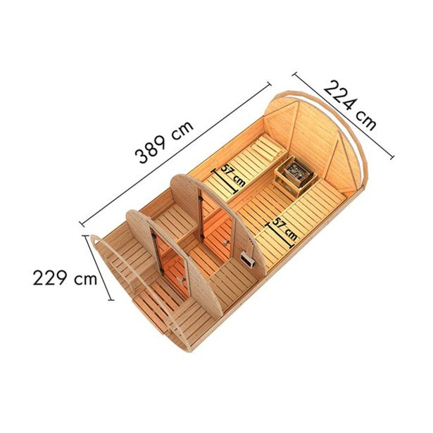 Savna Karibu sod s svojo edinstveno okroglo obliko predstavlja idealno dopolnilo vašemu vrtu, kjer se lahko po napornem dnevu sprostite v prijetnem okolju. Prostoren notranji del vključuje dve klopi iz lesa trepetlike, kar omogoča udobno sprostitev, medtem ko praktična predsoba nudi zaščiten prostor za preoblačenje in shranjevanje savnarskih pripomočkov. Po savnanju se lahko ohladite na dveh zunanjih klopeh na terasi, medtem ko okrogla zasnova zagotavlja optimalno kroženje zraka in toplote, kar povečuje učinek savne.