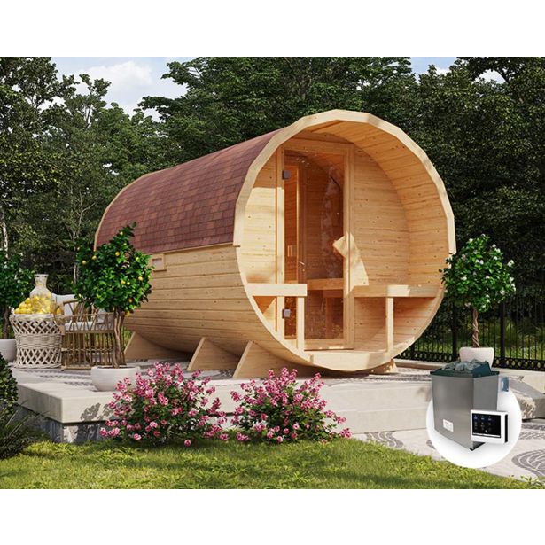 Savna je zasnovana s sodobnim sistemom čep-vijak, kar omogoča enostavno montažo brez potrebe po napenjalnih obročih, kar zmanjšuje vzdrževanje. Z višino 200 cm, širokimi klopmi in prostornimi vrati nudi udobje in dostopnost. Za dodatno zaščito in estetski videz priporočamo, da streho prekrijete z okrasnimi skodlami ali zaščitno folijo. Savna je opremljena s finsko pečjo Karibu 9kW in zunanjim regulatorjem Easy Finnish, kar zagotavlja optimalno ogrevanje s 18 kg diabaznih kamnov.